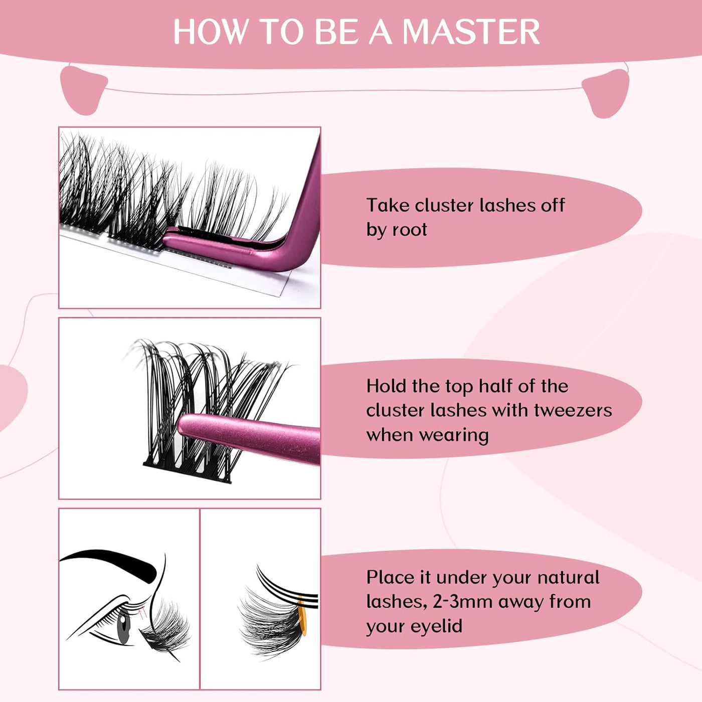 - How to Use: Apply the mascara wand cluster lash glue to your natural lashes and wait about 30 seconds.Gently take lashes off the strip by grab them at the root. Then apply the cluster lashes underneath your natural eyelashes, away 2-3mm from your eyelid! Finally, star your new day with your new eyelash!