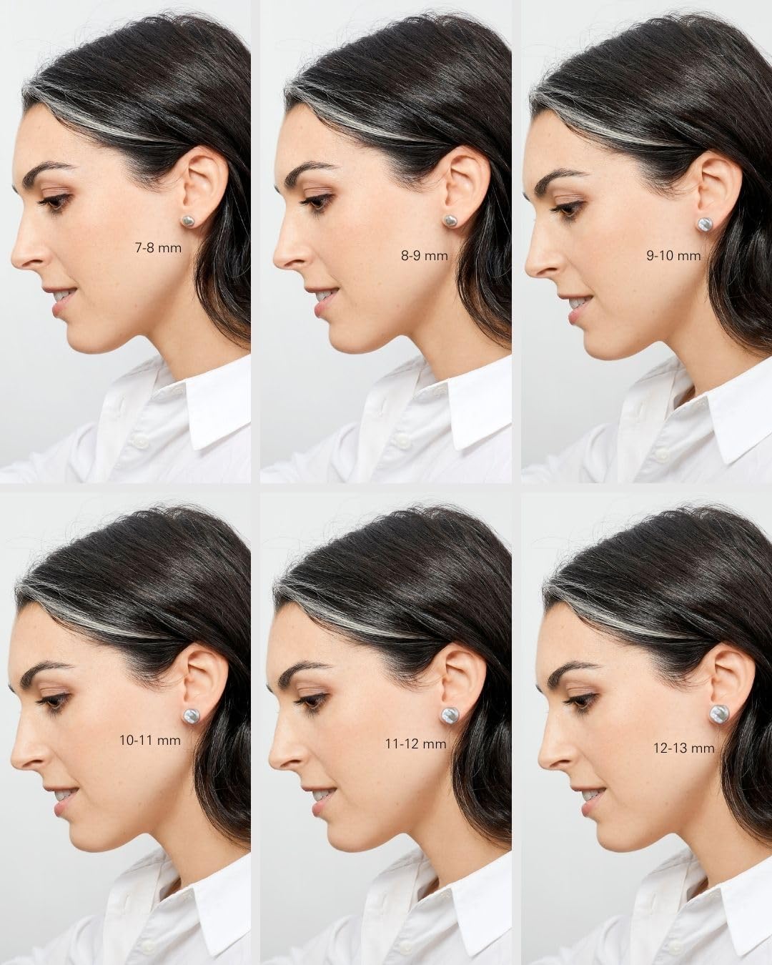 PEARL DETAILS AND SIZES | Origin: Freshwater Cultured Pearls | Shape: Keshi | Brightness: Intense, it's the most important quality | Color: Gray | Surface: Clean | Size: 7-8 mm, 8-9 mm, 9-10 mm, 10-11 mm, 11-12 mm, 12-13 mm, 13-14 mm, 14-15 mm and 15-16 mm. First 4 sices come with 6 mm backs and the others with 9 mm for much better support. See photo with measurements. The model is also using the correct size in each photo.